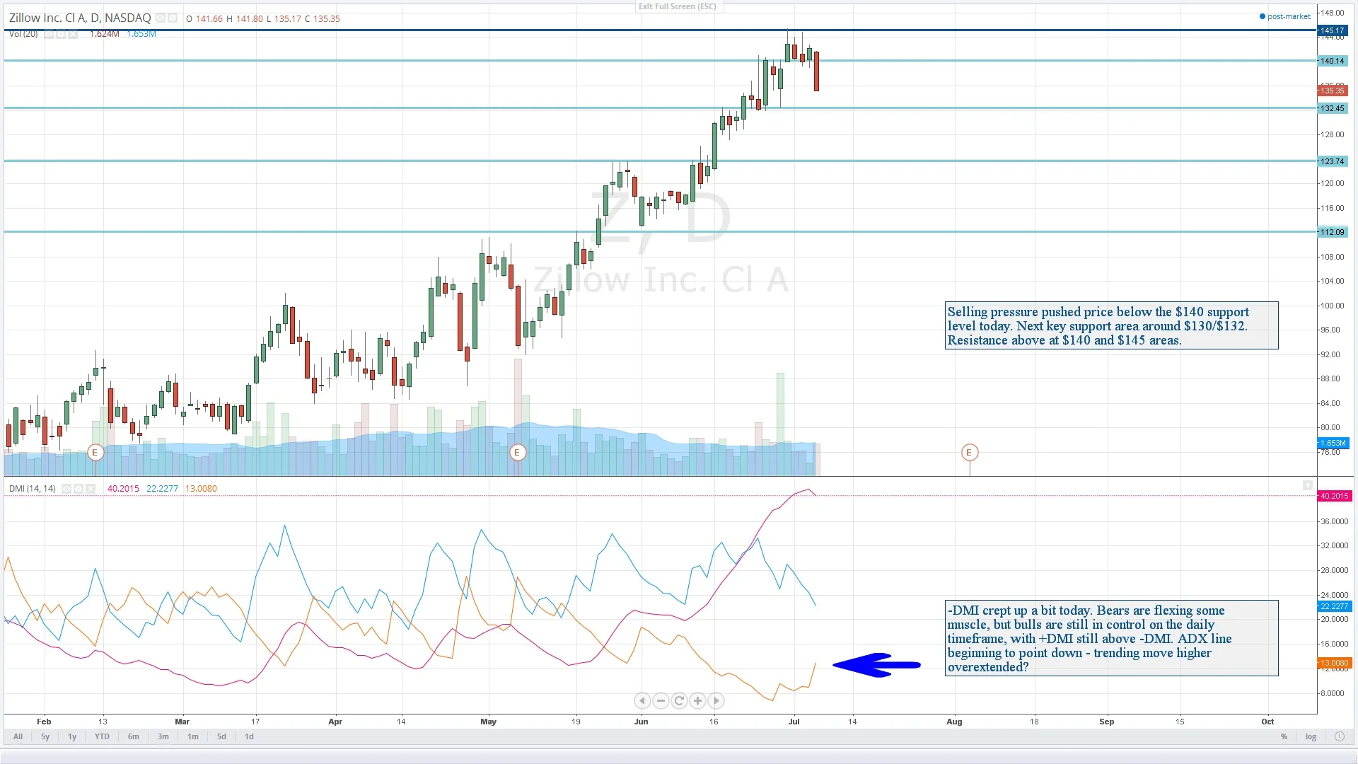 Our weekend analysis of the trending move higher in Zillow Inc. pointed out that the $140 level was key support from last week's trading. Z opened the day with a gap down from the 7/3/14 close, and selling pressure ultimately pushed the stock below the $140 level.
